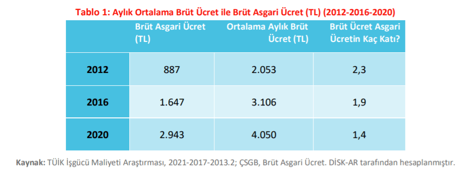 2012 yılında ortalama aylık brüt ücretlerin asgari ücretin 2,3 katı olduğunu kaydeden DİSK-AR bu rakamın 2016 yılında 1,9 ve 2020 yılında ise 1,4 kata gerilediğini ifade etti.
