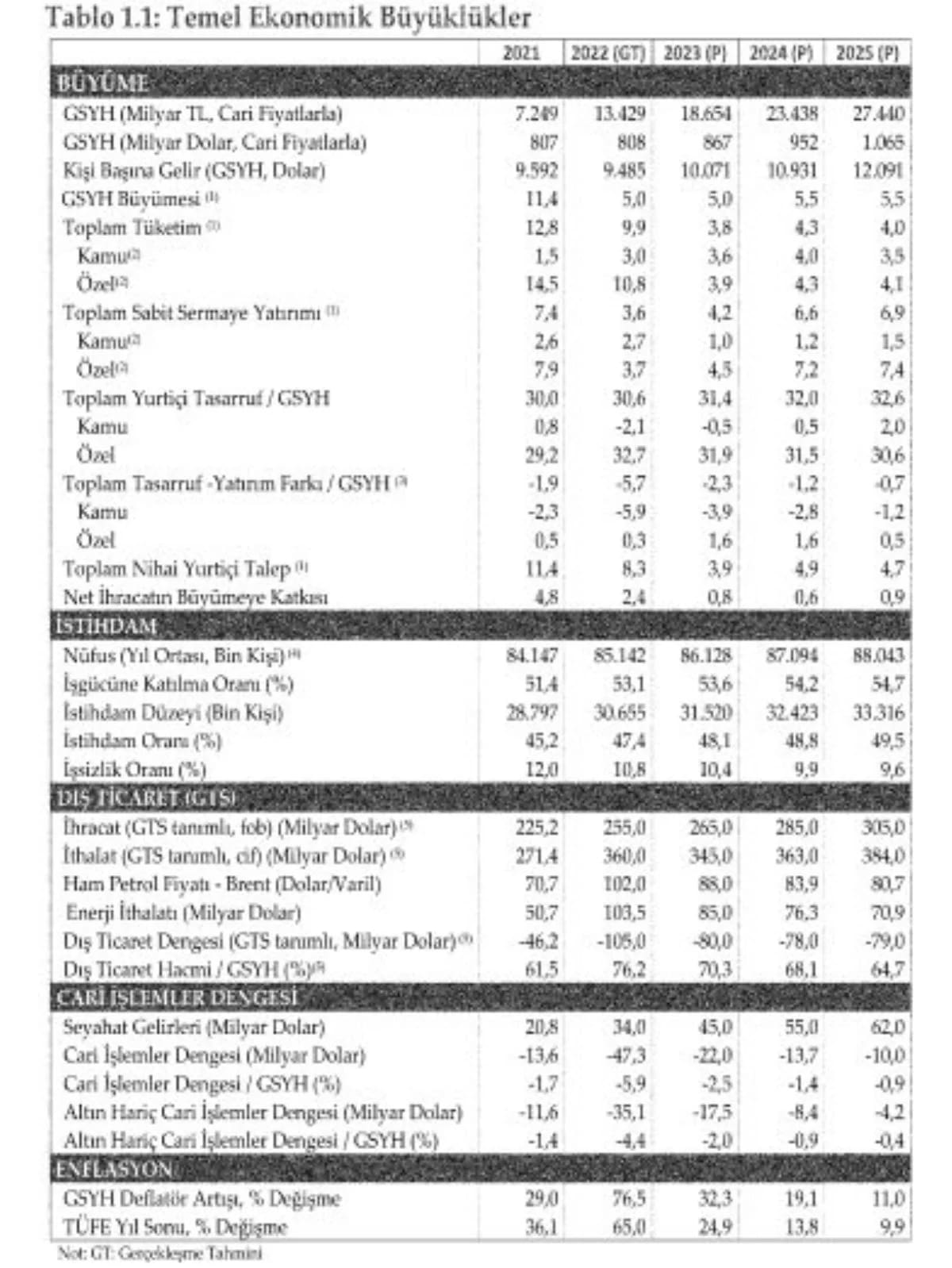 Hükümet milli gelir için tahminlerini TL ve ABD doları cinsi de paylaştı. Bu tahminlere göre hükümetin ortalama dolar/TL kuru tahminleri 2022 yılı için 16,62, 2023 yılı için 21,52, 2024 yılı için 24,62, 20225 yılı için 25,76 oldu.