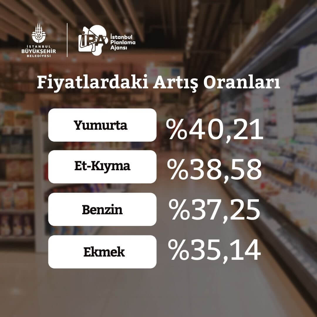 İmamoğlu’nun alıntıladığı İstanbul Planlama Ajansı’nın verilerine göre İstanbul’da yaşam maliyeti bir yılda yüzde 50.18 arttı. Fiyatı en çok artan ürünler ise yüzde 137 ile ayçiçek yağı, yüzde 109 ile buğday unu, yüzde 102 ile LPG ve yüzde 90 ile tuvalet kağıdı oldu.