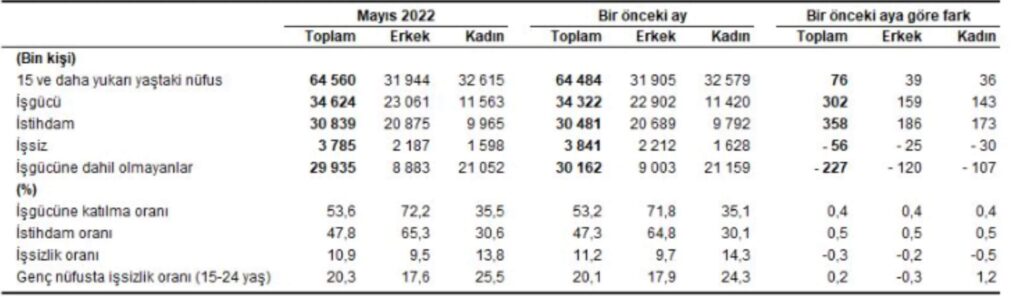 Hanehalkı İşgücü Araştırması sonuçlarına göre; 15 ve daha yukarı yaştaki kişilerde işsiz sayısı 2022 yılı Mayıs ayında bir önceki aya göre 56 bin kişi azalarak 3 milyon 785 bin kişi oldu. İşsizlik oranı ise 0,3 puanlık azalış ile %10,9 seviyesinde gerçekleşti. İşsizlik oranı erkeklerde yüzde 9,5 iken kadınlarda yüzde 13,8 olarak tahmin edildi.