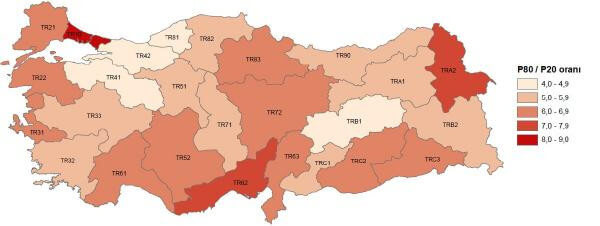 Gelir eşitsizliği oranı Türkiye’de 7,6 iken, bu değerin en düşük olduğu iller 4,1 ile Malatya, Elazığ, Bingöl, Tunceli, 4,3 ile Zonguldak, Karabük, Bartın ve Bursa, Eskişehir, Bilecik oldu. En yüksek ise 8,2 ile İstanbul, 7,7 ile Ağrı, Kars, Iğdır, Ardahan ve 7,2 ile Adana, Mersin oldu.