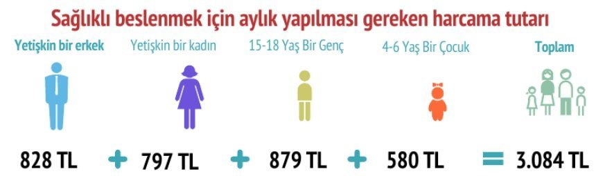 Buna göre, yetişkin bir kadının sağlıklı beslenmesi için yapması gereken günlük harcama tutarı 26.58 lira olurken, yetişkin bir erkeğin 27.6 lira, 15-18 yaş arası bir gencin 29.29 lira, 4-6 yaş arası bir çocuğun ise 19.35 lira oldu.