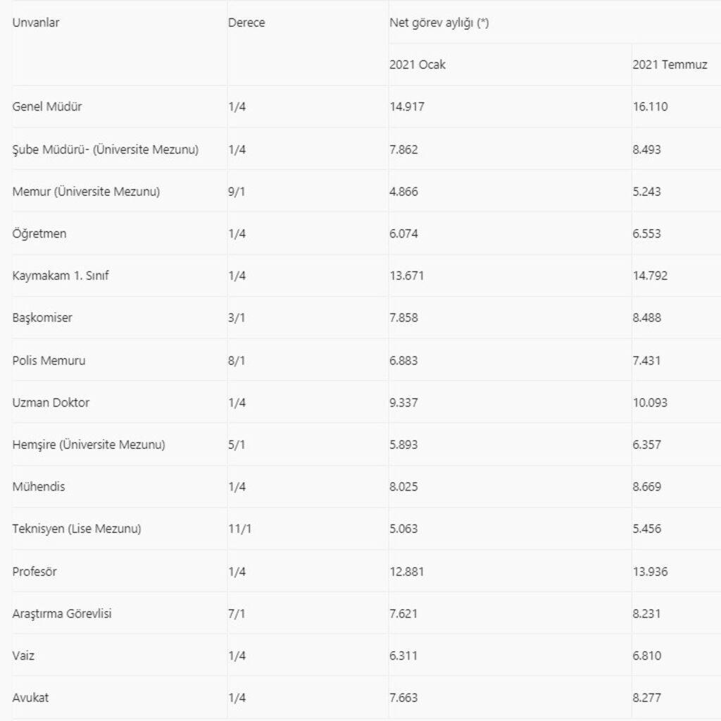 Temmuz 2021 dönemi itibarıyla bazı kamu görevlilerinin net görev aylığı şöyle: