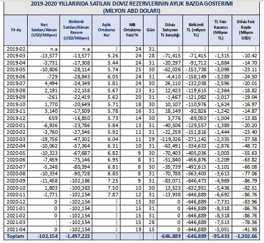 – Bizzat Merkez Bankası tarafında “Uluslararası Rezervler ve Döviz Likiditesi” adıyla EVDS’de yayımlanan zaman serilerinden elde edilen özet sonuçlara göre, 2019 Mart ayı ile 2020 Kasım ayı arasında (21 ayda) Merkez Bankası tarafından toplam 116.2 milyar dolar satılmış ve aynı aralıkta 14.1 milyar dolar da satın alınmış ve sonuçta rezervlerden satılan veya eksilen net tutar 102.1 milyar dolar olmuştur.