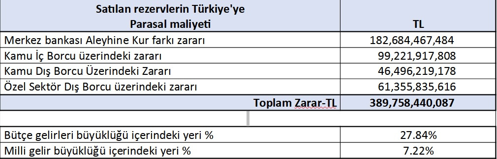 – Sonuçta Rezerv Satışları nedeniyle, toplamda mevcut durumda toplam olarak şu ana kadar oluşan 390 milyar TL zarar, bütçe gelirlerinin yüzde 27.84’ünü, Millî gelirin ise yüzde 7.22’sını teşkil edecek önem ve büyüklüktedir. Türkiye Cumhuriyet tarihinde, işlem bazında bu zarardan daha büyük ve daha kapsamlı bir zarar bulunmamaktadır.
