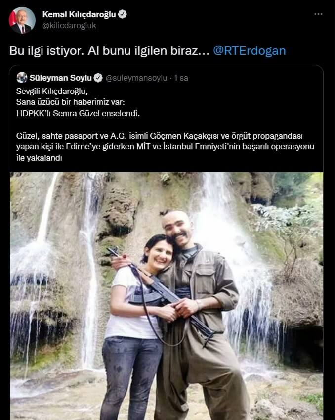 Soylu bu paylaşımına ilişkin CHP Genel Başkanı Kemal Kılıçdaroğlu, AKP Genel Başkanı ve Cumhurbaşkanı Erdoğan’a çağrıda bulundu.