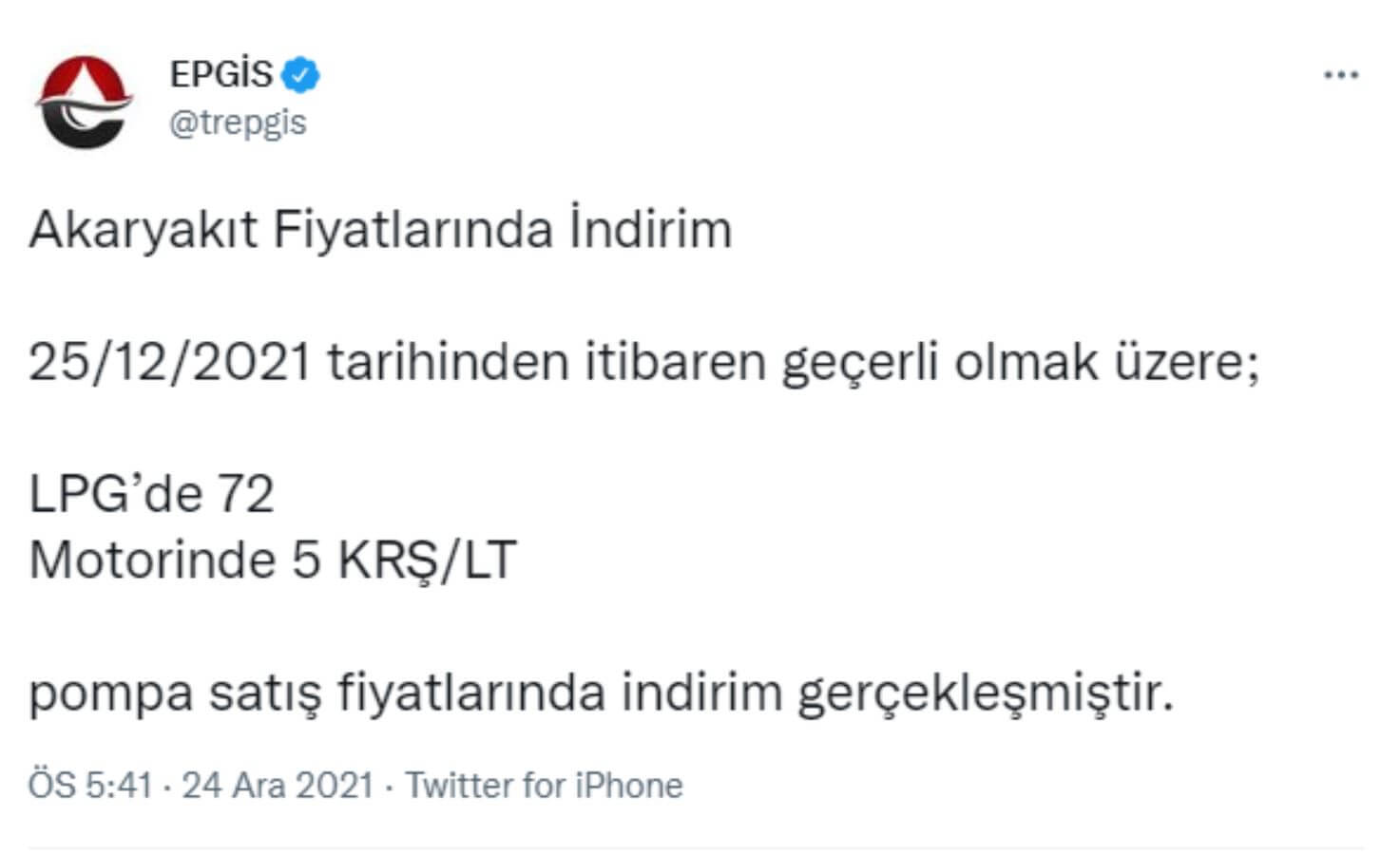 EPGİS tarafından yapılan açıklamada, 25 Aralık 2021 tarihinden itibaren geçerli olmak üzere; LPG’de 72 kuruş, motorinde 5 kuruş indirim yapıldığı duyuruldu.