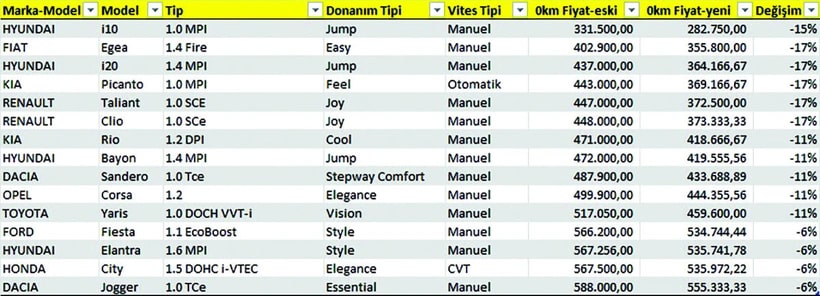 Karar’dan Ali Yıldırım’ın haberine göre, ocak ayından bu yana artan fiyatlar yine yüzde 45’lik dilimi boşa çıkardı. Sadece Hyundai’nin i10 modeli yüzde 45’lik dilime girmiş oldu. Yapılan düzenleme, fiyatı 595 bin TL’nin altında olan sınırlı sayıdaki aracı kapsıyor. İndirim oranı da yüzde 5,5 ila yüzde19 arasında değişiyor. Toplamda 96 modelin fiyatında değişiklik oldu.