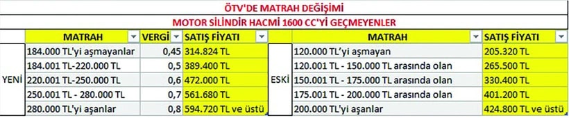 1600 cc altı otomobillerde vergiler dahil satış fiyatı 594 bin 722 liranın üstünde olan otomobillerin fiyatında herhangi bir değişiklik olmadı. Öte yandan, motor silindir hacmi 1600 cc üstündeki konvensiyonel otomobillerin, neredeyse tamamı ithal olan otomobillerin matrahlarında herhangi bir değişikliğe gidilmedi.