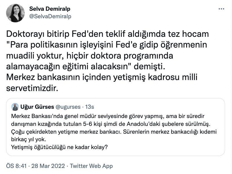 Kişisel Twitter hesabında paylaşımda bulunan eski Merkez Bankası yöneticisi ekonomist Uğur Gürses, “Merkez Bankası’nda genel müdür seviyesinde görev yapmış, ama bir süredir danışman kızağında tutulan 5-6 kişi şimdi de Anadolu’daki şubelere sürülmüş. Çoğu çekirdekten yetişme merkez bankacı. Sürenlerin merkez bankacılığı kıdemi birkaç yıl yok. Yetişmiş öğütücülüğü ne kadar kolay?” dedi.