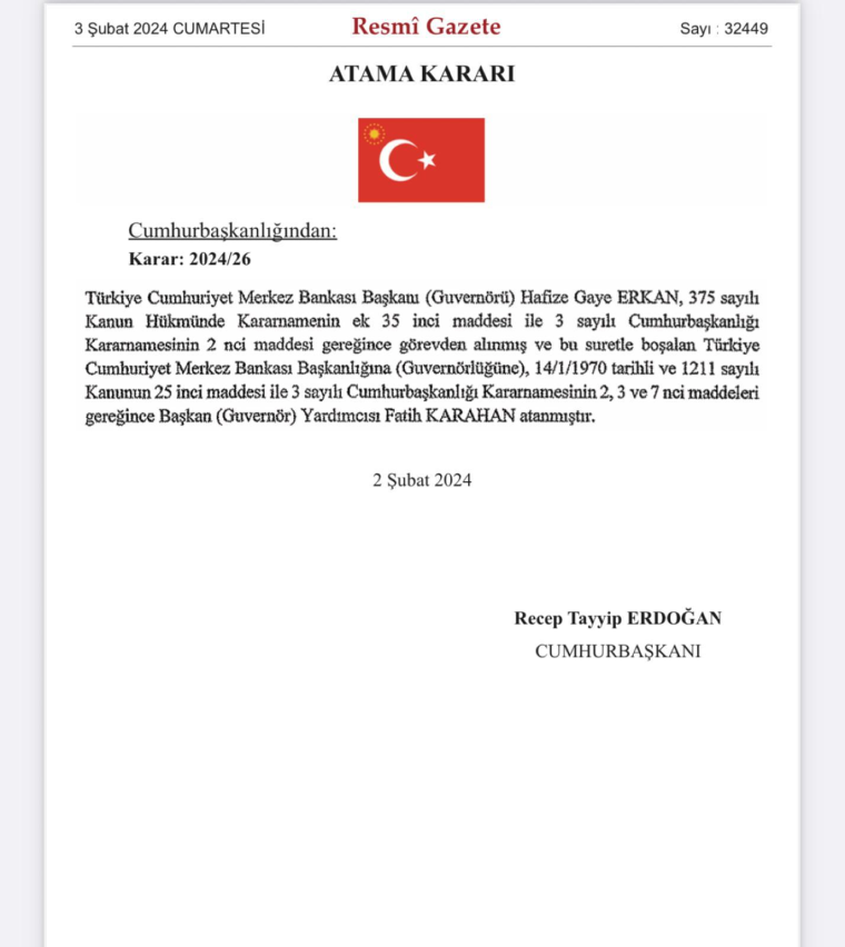 Resmi Gazete’de yayımlanan Cumhurbaşkanı Kararı’na göre, Merkez Bankası Başkanlığı görevine Başkan Yardımcısı Fatih Karahan atandı.