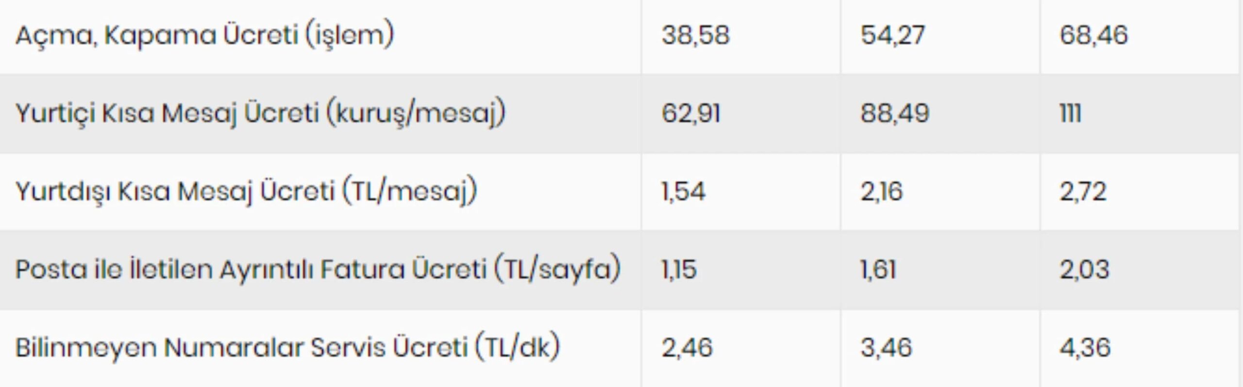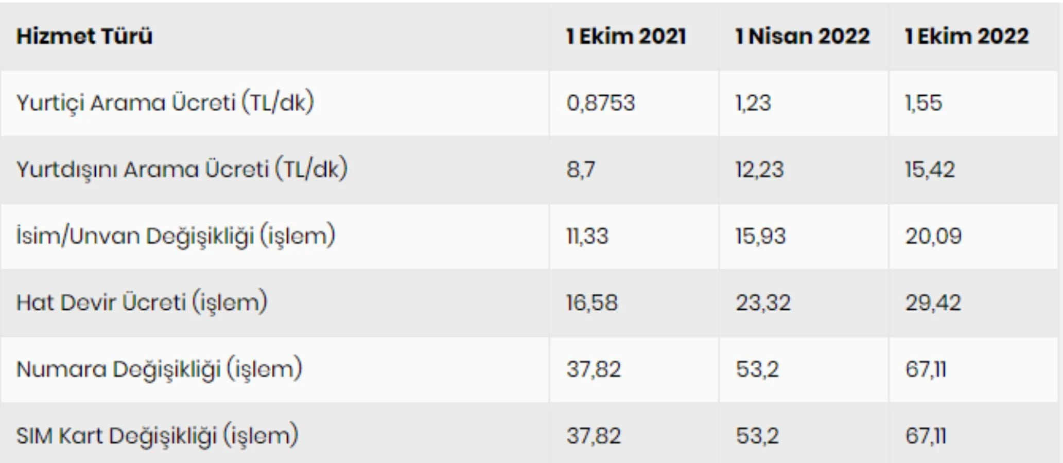 Geçen yılın Ekim ayında 8.7 TL olan yurtdışı aramanın dakika ücreti, 1 Ekim 2022’den itibaren 15.42 TL’ye, hat devir ücreti 16.58 TL’den 29.42 TL’ye, numara değişikliği ücreti 37.82 TL’den 67.11 TL’ye, açma kapama ücreti 38.58 TL’den 68.46 TL’ye çıkmış oldu.