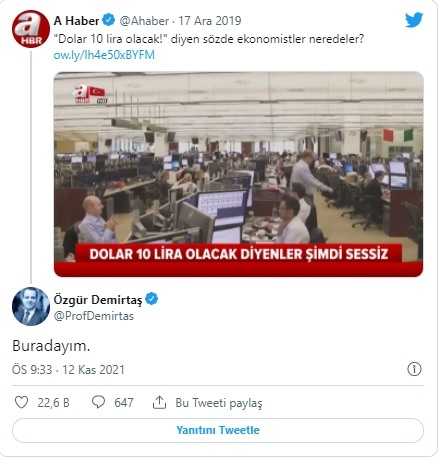 Demirtaş, A Haber’in “‘Dolar 10 lira olacak’ diyen ekonomistler neredeler” tweetinin altına “Buradayım” yazdı.