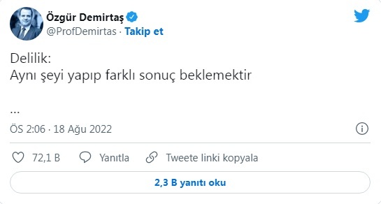 Sosyal medya hesabından faiz indirimi kararına tek cümlelik bir paylaşımla yapan Demirtaş, ‘Delilik: Aynı şeyi yapıp farklı sonuç beklemektir’ mesajını paylaştı.