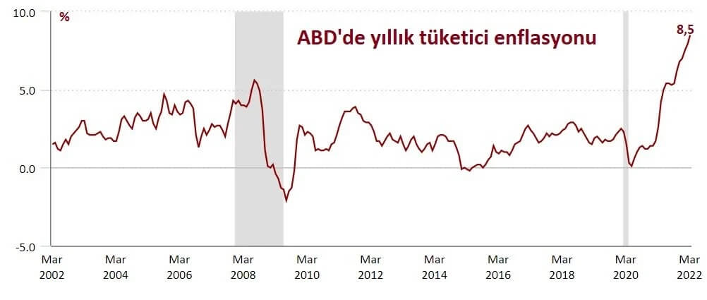 ABD’de tüketici enflasyonu, martta yüzde 8,5’e yükseldi. Bu oran, Aralık 1981 sonrasındaki 40 yılı aşan dönemin zirvesi oldu.