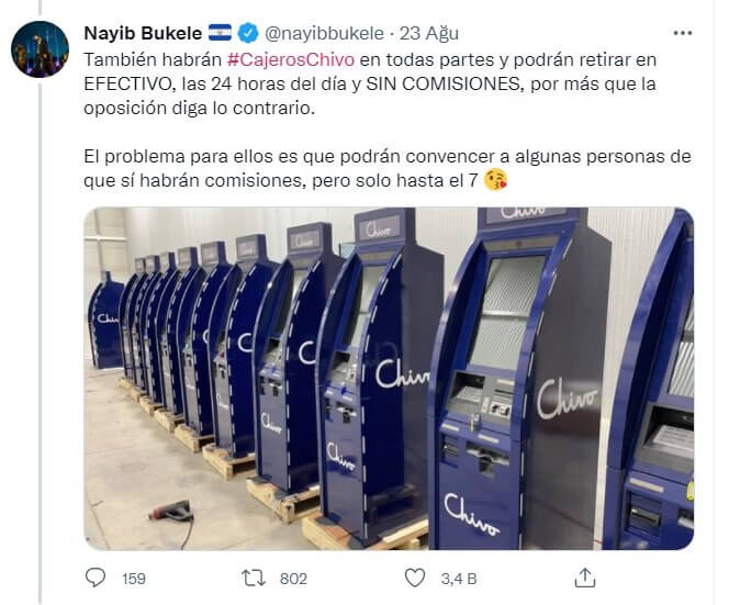Hükümet, başlangıçta Chivo adlı dijital cüzdanla çalışacak 200 bankamatik kuracak. Chivo, İspanyolca argoda ‘havalı’ anlamına gelen bir kelime.