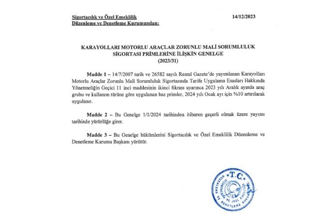 Söz konusu karar ilişkin genelge kurumun resmi internet sitesinden duyuruldu. Buna göre, 2024 yılının ilk 4 ayı içinde belirlenen trafik sigortasındaki yüzde 5’lik prim artışı ocak 2024 için yüzde 10’a çıkarıldı.