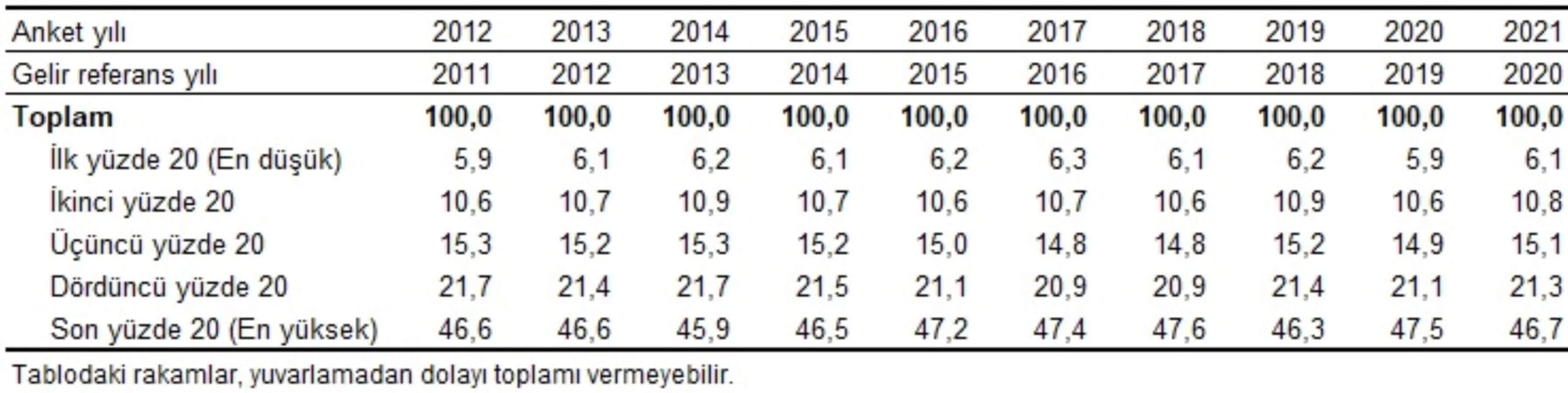 Son yapılan araştırma sonuçlarına göre; en yüksek eşdeğer hanehalkı kullanılabilir fert gelirine sahip yüzde 20’lik grubun toplam gelirden aldığı pay bir önceki yıla göre 0,8 puan azalarak yüzde 46,7’ye düşerken, en düşük gelire sahip yüzde 20’lik grubun aldığı pay 0,2 puan artarak yüzde 6,1’e yükseldi.