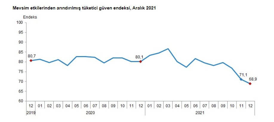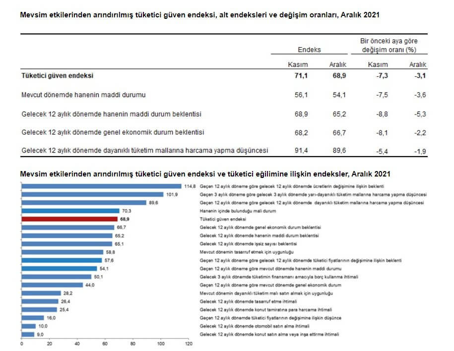 Türkiye İstatistik Kurumu (TÜİK), Aralık 2021 Ekonomik Güven Endeksi verilerini açıkladı. Buna göre mevsim etkilerinden arındırılmış tüketici güven endeksi, aralıkta bir önceki aya göre %3,1 oranında azaldı; Kasımda 71,1 olan endeks, aralık ayında 68,9 oldu.