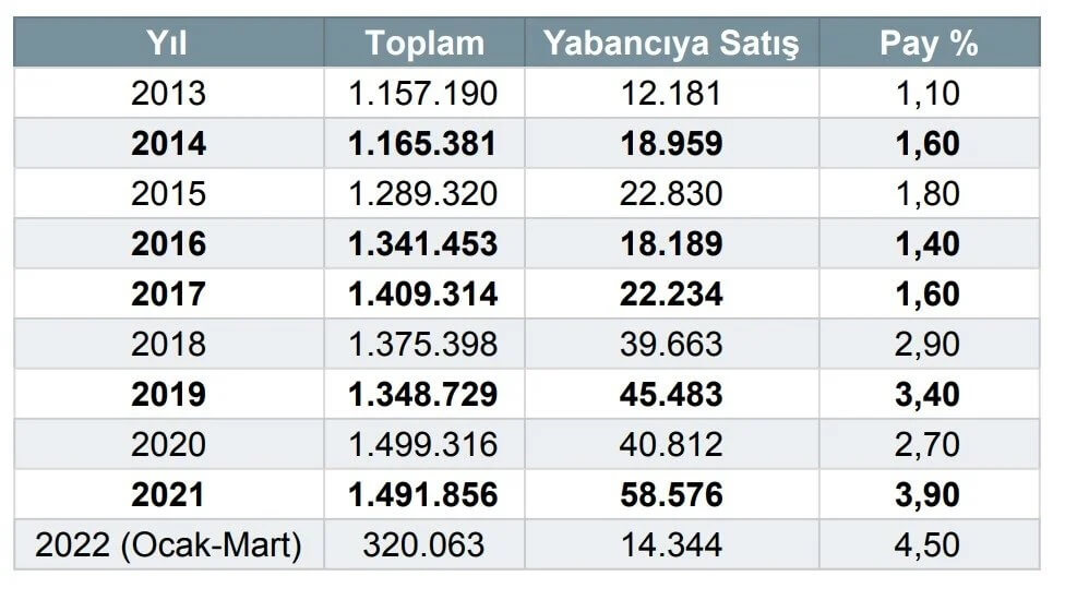 2013 yılında toplam konut satışları içinde yüzde 1,1 olan yabancıya satışların payı, 2022’nin ilk üç ayında yüzde 4,5’e yükseldi.