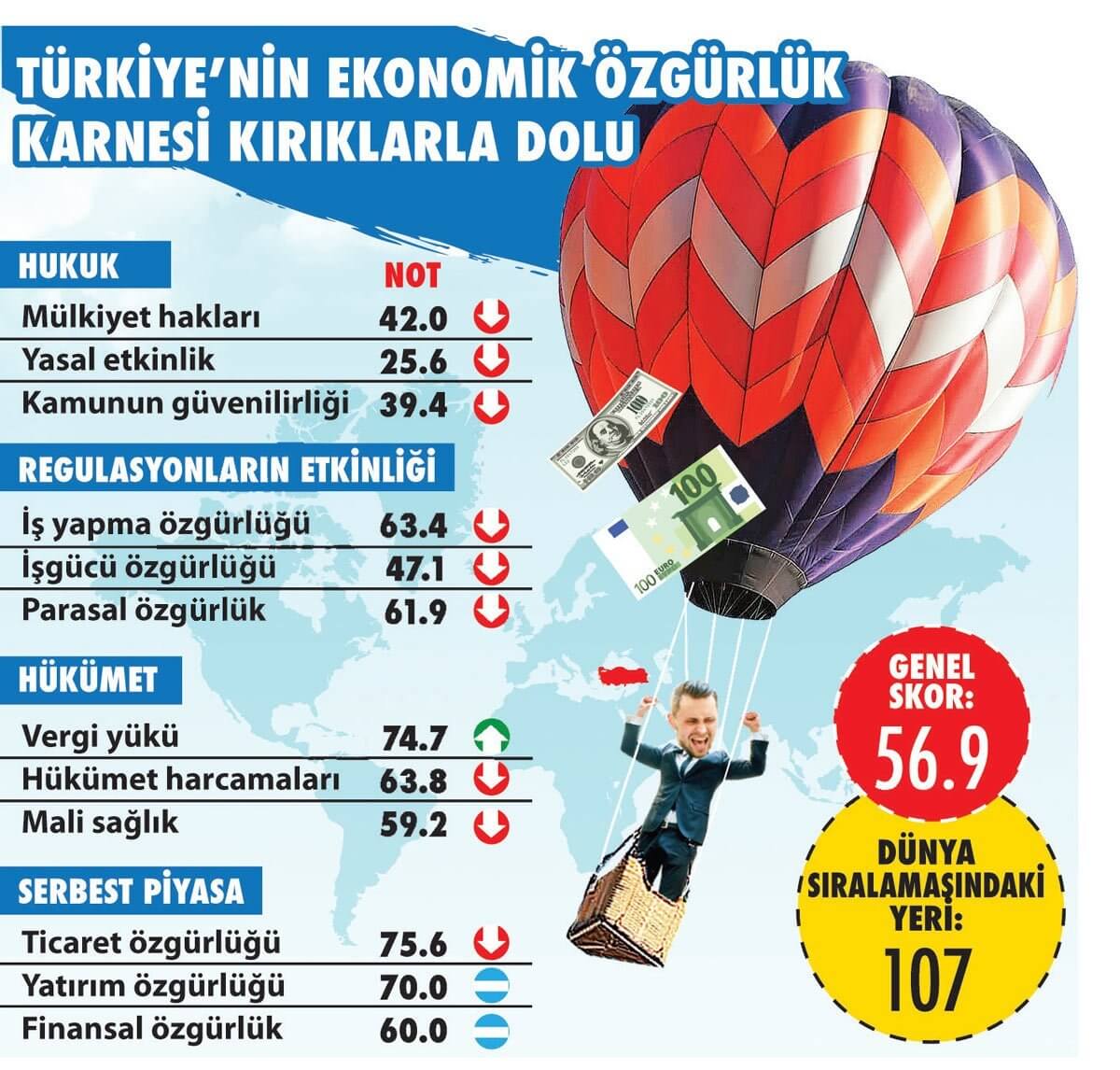 Sözcü’den Özlem Ermiş Beyhan’ın haberine göre raporun detaylarına bakıldığında, Türkiye’nin notunun kırılmasında mali sağlıktaki bozulmanın ve hukukun üstünlüğü puanlarındaki keskin düşüşün etkili olduğu görüldü. Rüşvet ve yolsuzluk konularındaki ülke notu- nu gösteren ‘Kamunun güvenilirliği’nde de Türkiye ortalamanın çok altında bir puan alabildi. Türkiye’nin ekonomik özgürlük notunun hem bölge hem de global ortalamanın altına gerilediği vurgulandı. Raporda özgürlükler ne kadar genişse ekonomilerin o kadar sağlıklı büyüdüğü, bunun halkların zenginleşmesinde etkili olduğu belirtildi.