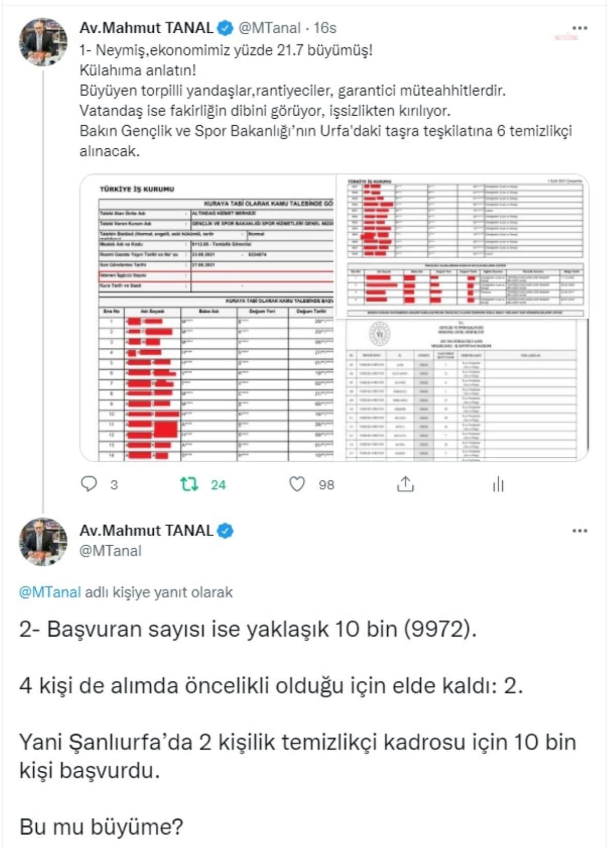 CHP İstanbul Milletvekili Mahmut Tanal, TÜİK tarafından açıklanan ekonominin yüzde 21.7 büyüdüğüne ilişkin verilere, Şanlıurfa’da Gençlik ve Spor İl Müdürlüğü’nün İŞKUR üzerinden alacağı 6 kişilik temizlikçi kadrosuna 10 bin kişi başvurduğunu gösteren listeyi yayınlayarak tepki gösterdi.