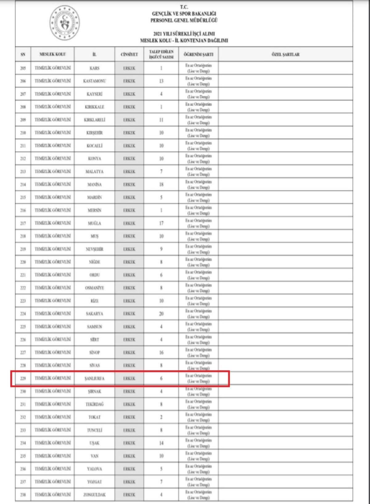 İşte bakın Gençlik ve Spor Bakanlığı’nın Şanlıurfa’daki taşra teşkilatına 6 temizlikçi alınacak.