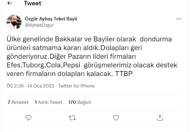 Özgür Aybaş, “Ülke genelinde Bakkallar ve Bayiler olarak dondurma ürünleri satmama kararı aldık. Dolapları geri gönderiyoruz. Diğer Pazarın lideri firmaları Efes, Tuborg, Cola, Pepsi görüşmelerimiz olacak destek veren firmaların dolapları kalacak.” ifadelerini kullandı.