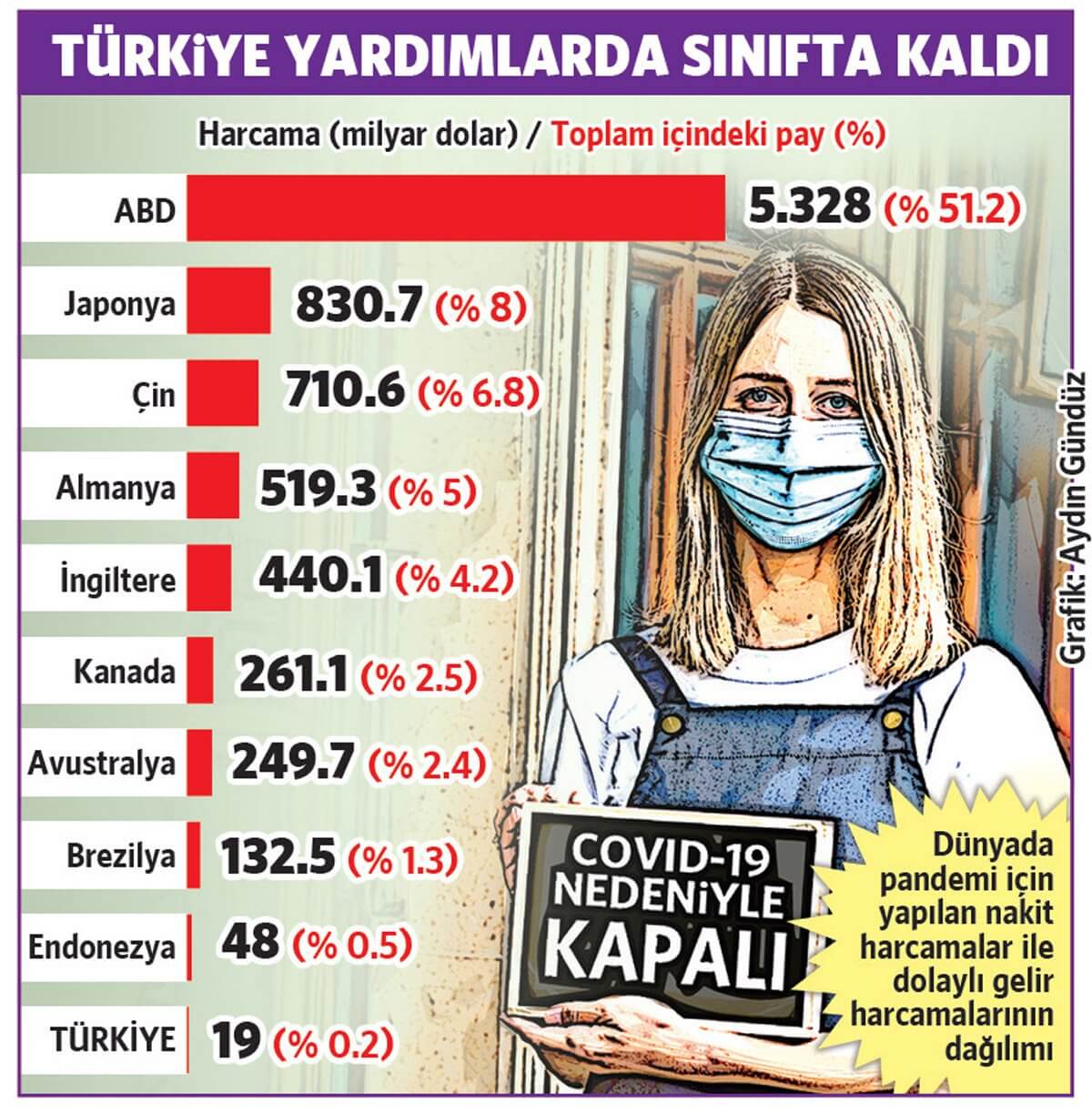 Tüm dünyada sağlıkta yarattığı krizle birlikte ekonomileri de büyük bir sarsıntıya uğratan Covid-19 pandemisinde ülkeler, vatandaşlarına sağladıkları nakit desteği ile çöküşü engellemeye çalışırken, Türkiye’de ise halk öksüz kaldı. Pandemi başlangıcından Haziran 2021’e kadar sağlanan desteklerin toplamının 19 milyar dolarda kaldığı Türkiye, gayri safi yurtiçi hasılanın (GSYH) sadece yüzde 2.7’si kadar yaptığı yardım ile dünyada vatandaşına en az destek veren ülkeler arasında yer aldı. 10.7 milyon nüfusa sahip Yunanistan toplam 38.9 milyar dolar, 4.9 milyon nüfusa sahip Yeni Zelanda 40.4 milyar dolar nakit harcama ve dolaylı gelir desteği sağlarken, 84 milyon nüfusa sahip Türkiye, vatandaşına yalnızca 19 milyar dolarlık ek harcama ve dolaylı gelir desteği sağladı.