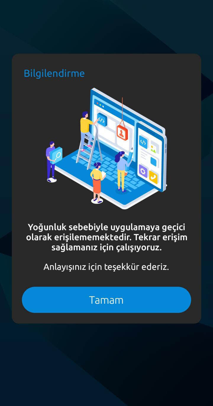 “Yoğunluk sebebiyle uygulamaya geçici olarak erişilememektedir. Tekrar erişim sağlamanız için çalışıyoruz. Anlayışınız için teşekkür ederiz.”
