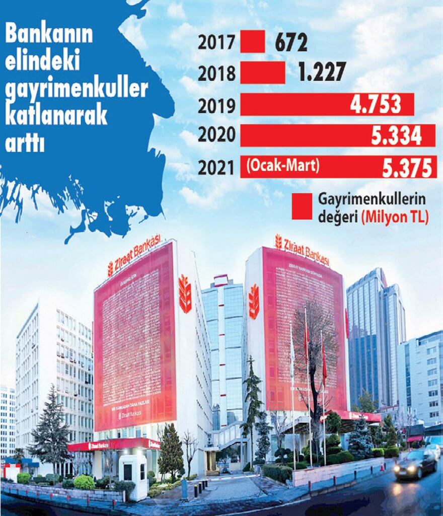 Son dönemde Demirören Grubu’na Doğan Holding’in medya varlıklarının alımı için verilen krediler ve sonrasında uhdesine geçirdiği Kemer Country golf arazileriyle gündemde olan Ziraat Bankası’nın Mart 2021 sonu itibarıyla yıllar içinde bireysel, ticari ve zirai alacaklar nedeniyle edindiği gayrimenkullerin miktarı 5 milyar 375 milyon liraya ulaşmış durumda.
