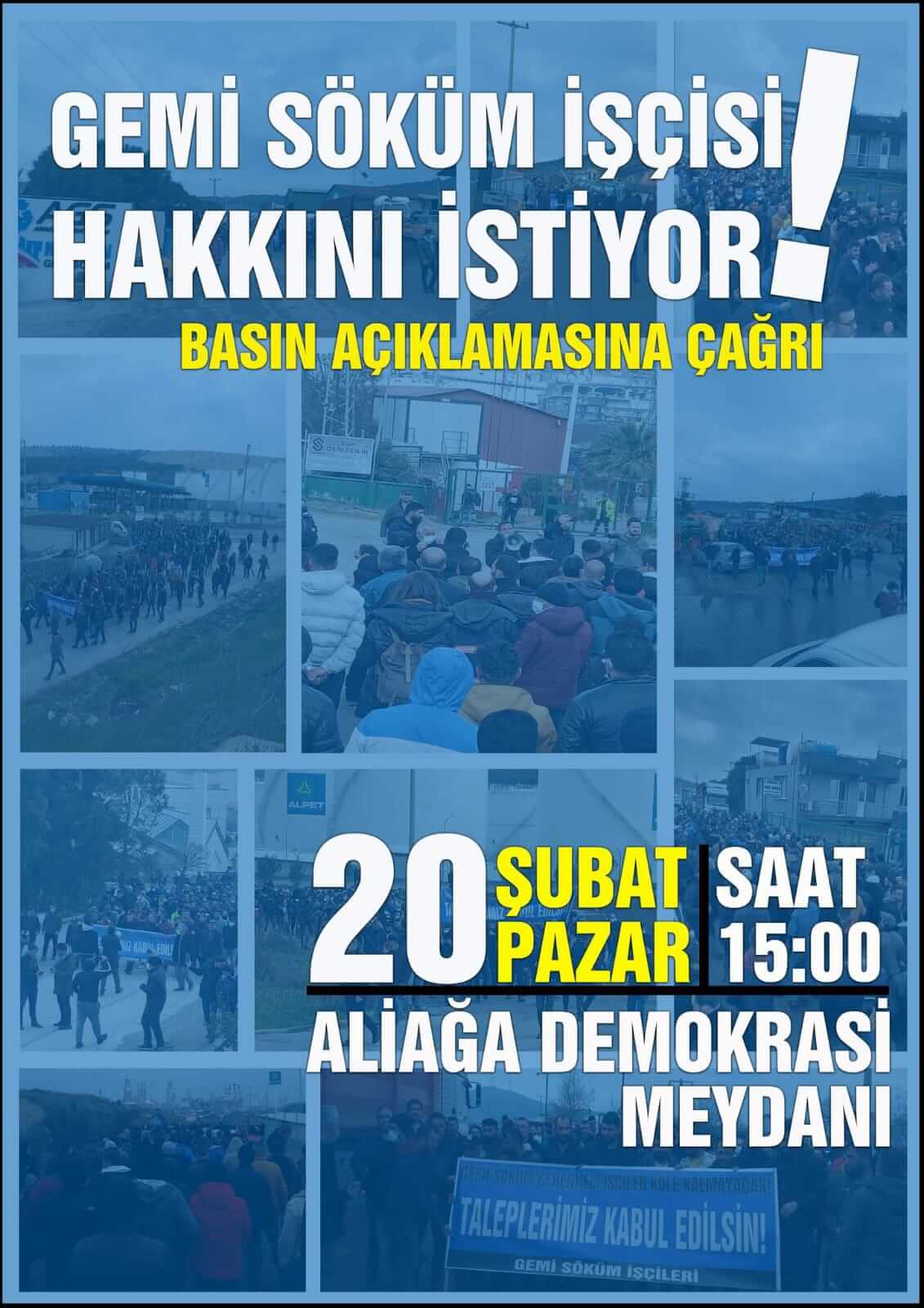 Hakları için mücadeleye başlayan gemi söküm işçileri yarın Aliağa Demokrasi Meydanı'nda basın açıklaması yapacak.