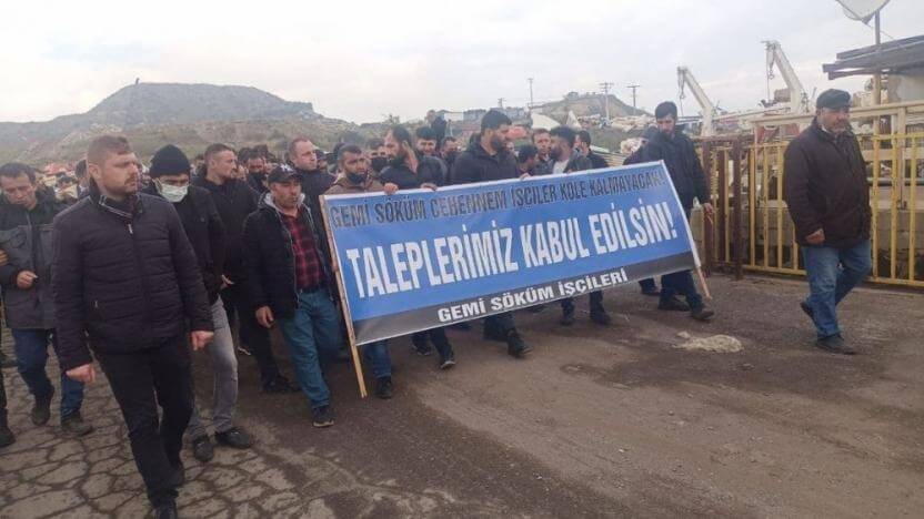 İzmir Aliağa gemi söküm tesislerinde patronlar adına Gemi Geri Dönüşüm Sanayicileri Derneği (GEMİSANDER) Başkanı Kamil Önal’ın işçi temsilcileriyle yaptığı görüşmede işçilerin taleplerinin kabul edilmemesi nedeniyle direnişe devam denilmişti.