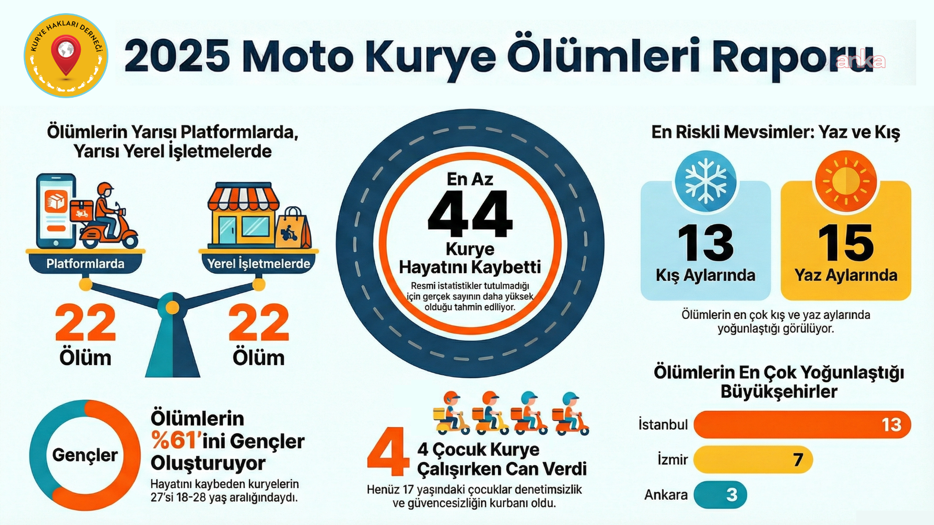 Derneğin çalışmasına göre, 2025 yılında Türkiye genelinde en az 44 moto kurye çalışırken hayatını kaybetti. Raporda, “Denizli’de mesai sırasında alkollü bir sürücünün çarpması sonucu yaşamını yitiren 25 yaşındaki Muratcan Pekeroğlu’nun veya Çorum’da henüz 17 yaşında bir siparişi yetiştirmeye çalışırken hayattan koparılan Mert Ali Yigen’in ölümleri, bu istatistiğin arkasındaki ağır insani bedelin sadece iki örneğidir” denildi.