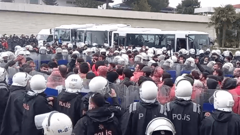 Açıklamanın ardından işçiler, bekleyişini sürdürdü. Bu sırada çevik kuvvet ekipleri işçilere müdahale etti. İşçileri ablukaya alan polisler, aralarında Neslihan Acar’ın ve sendika yöneticilerinin de bulunduğu onlarca işçiyi ters kelepçeyle gözaltına aldı.