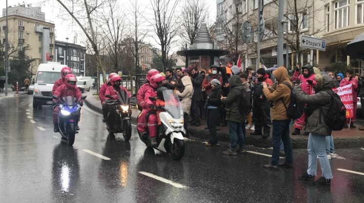 Bugün de Gümüşsuyu’ndaki Almanya Başkonsolosluğu önünde toplanan kuryeler, zam oranlarının yeniden düzenlenmesini talep etti. Haklarının verilmesini isteyen kuryeler, yağmur altında pankart açıp slogan attı.