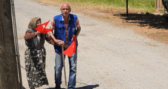 Zabıta personelinin Türk bayrağı verdiği Tekin, bir elinde bayrak diğer elinde bastonuyla konvoyu selamladı.
