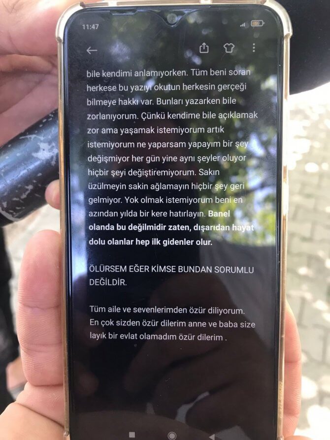 Bıraktığı notta, “Hiçbir zaman konuşkan ve derdini anlatan biri olmadım. Ama artık anlatabilirim. Ben başa çıkamıyorum artık hayat ile mutluluk ve yaşamın bu dünyada bir ev, araba ve evlilik olması kadar saçma bir şey yok. Bu yaşıma kadar yaşayan bir ölü gibiydim. Hiçbir zaman ne mutlu ne de tatmin oldum. Sadece siz öyle olduğumu sandınız. Şimdi belki mutlu olacağım bir yere gitmek beni umutlandırıyor. Kimse ne beni düşünsün ne de arkamdan ağlasın. Beni sevenlerden ve ailemden özür diliyorum. Son çare bu mecburum. Çünkü yaşadıkça daha çok acı çekiyorum. Biliyorum, 2-3 gün konuşulup unutulacağım. Ardımdan bu yazıyı okuyun ki belki beni anlarsınız. Ben bile kendimi anlamıyorken. Tüm beni soran herkese bu yazıyı okutun. Herkesin gerçeği bilmeye hakkı var. Bunları yazarken bile zorlanıyorum. Çünkü kendimi bile açıklamak zor ama artık yaşamak istemiyorum. İstemiyorum ne yaparsam yapayım hiçbir şey değişmiyor. Her gün yine aynı şeyler oluyor. hiçbir şeyi değiştiremiyorum. Sakın üzülmeyin sakın ağlamayın. Hiçbir şey geri gelmiyor. Yok olmak istemiyorum. Beni en azından yılda bir kez hatırlayın. Dışardan hayat dolu olanlar hep ilk giden olur. Ölürsem eğer kimse bundan sorumlu değildir. Tüm aile ve sevenlerimden özür diliyorum. En çok sizden özür diliyorum. Anne ve baba size layık bir evlat olamadım, özür diliyorum” ifadeleri yer almıştı. (Elazığ Hakimiyet)