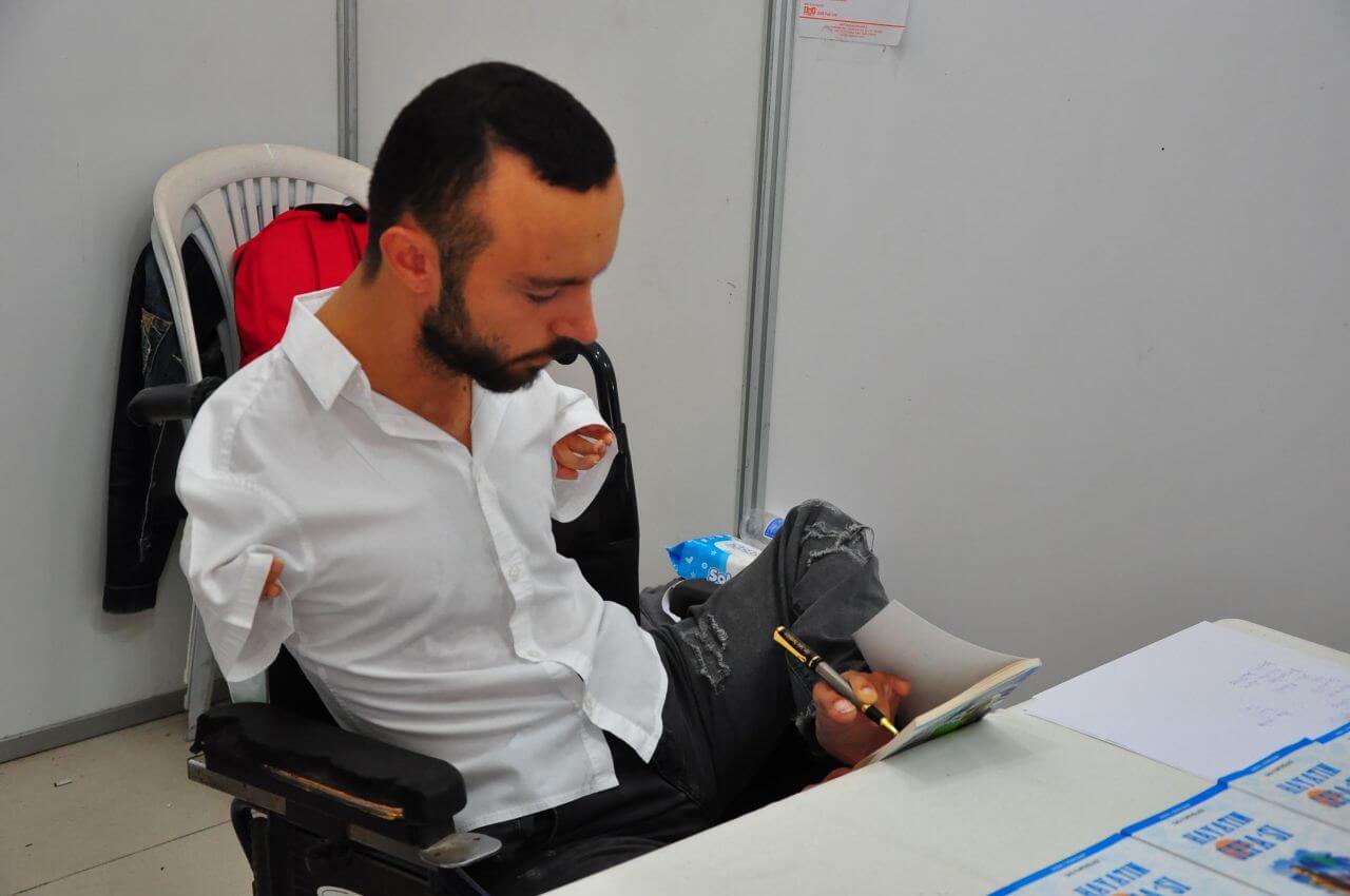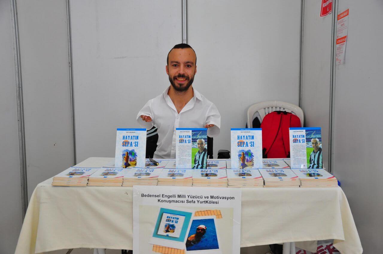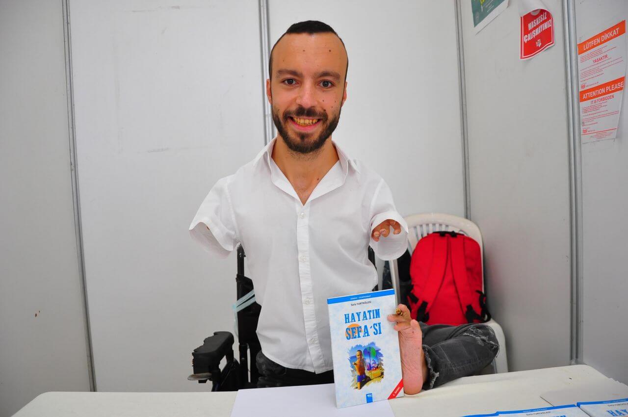 Manisa’nın Şehzadeler ilçesinde Trombositopeni-radius yokluğu (TAR) sendromu ile dünyaya gelen bedensel engelli Sefa Yurtkölesi (26), sol ayağıyla 6 ayda yazdığı ve hayat hikayesini ele aldığı ‘Hayatın Sefa’sı” isimli kitabını, yine ayağıyla okuyucularına imzaladı.
