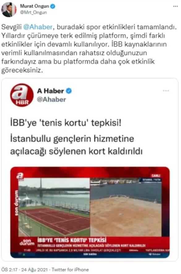 Ongun yanıtında, “Sevgili A Haber, buradaki spor etkinlikleri tamamlandı. Yıllardır çürümeye terk edilmiş platform, şimdi farklı etkinlikler için devamlı kullanılıyor. İBB kaynaklarının verimli kullanılmasından rahatsız olduğunuzun farkındayız ama bu platformda daha çok etkinlik göreceksiniz” dedi.