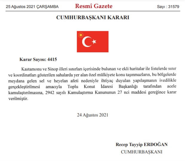 Batı Karadeniz’de sel ve heyelan felaketinin yaşandığı Kastamonu ve Sinop için de acele kamulaştırma kararı alındı.