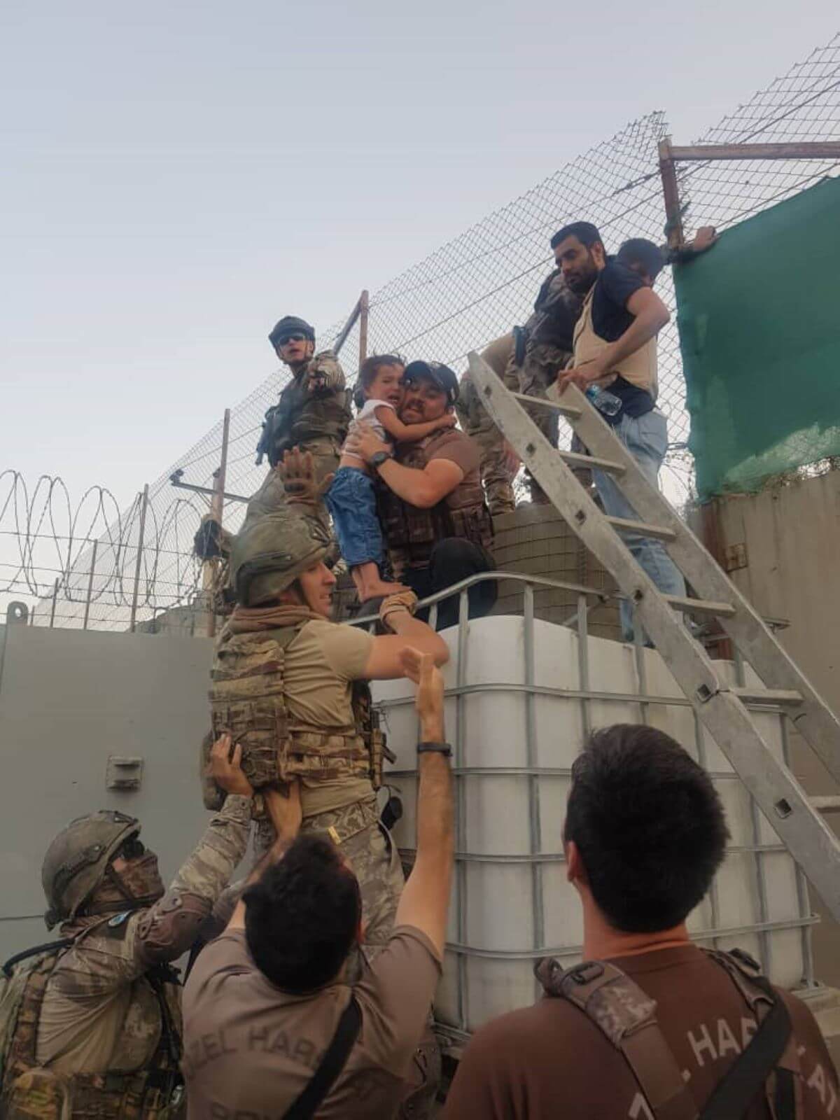 Bu arada havalimanındaki kalabalıkta Türklere de Türk güvenlik güçleri yardım etti. Yüzlerce kişi arasındaki Türkler alınarak güvenli alana götürüldü. Bir Türk ailenin küçük çocuğu da kalabalık arasından alındı. Türk askerleri ve polislerinin kucağında güvenlik alana götürülen aile de tahliye uçağı ile Türkiye’ye gönderilecek.