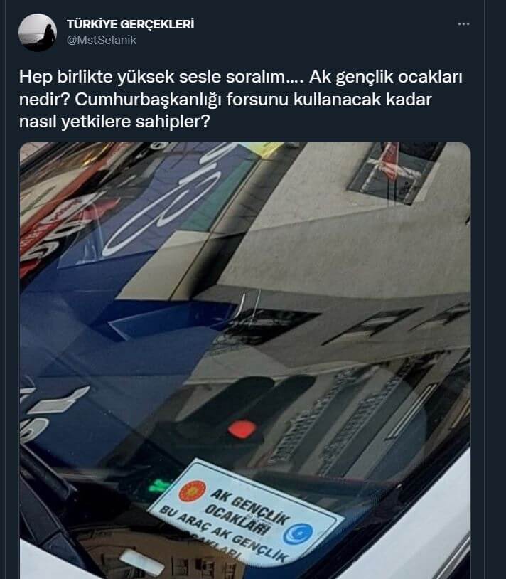 “Türkiye Gerçekleri” isimli Twitter kullanıcısı paylaştığı fotoğraflarla gündem oldu. İlk paylaşımda bir arabanın ön camına konmuş kağıtta cumhurbaşkanlığı forsu ile birlikte ‘Ak Gençlik Ocakları’na ait olduğu görülürken, diğer paylaşımda ise lüks bir makam aracının plakasının komple kapatıldığı ve ‘AK Gençlik Ocakları Genel Başkanı’ yazdığı görüldü.