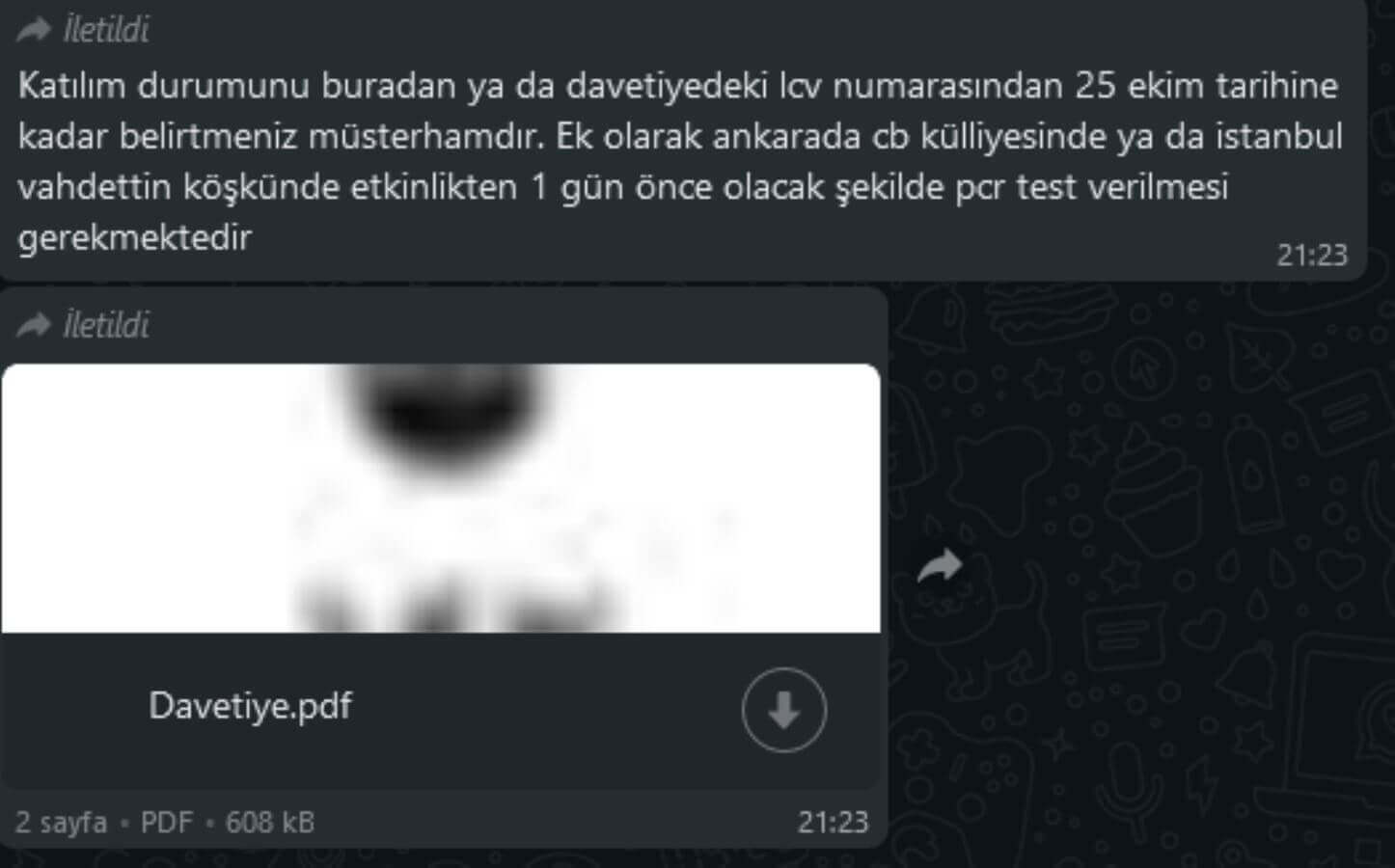 “Katılım durumunu buradan ya da davetiyedeki lcv numarasından 25 Ekim tarihine kadar belirtmeniz müsterhamdır. Ek olarak Ankara’da CB Külliyesi’nde ya da İstanbul Vahdettin Köşkü’nde etkinlikten bir gün önce olacak şekilde PCR test verilmesi gerekmektedir.”