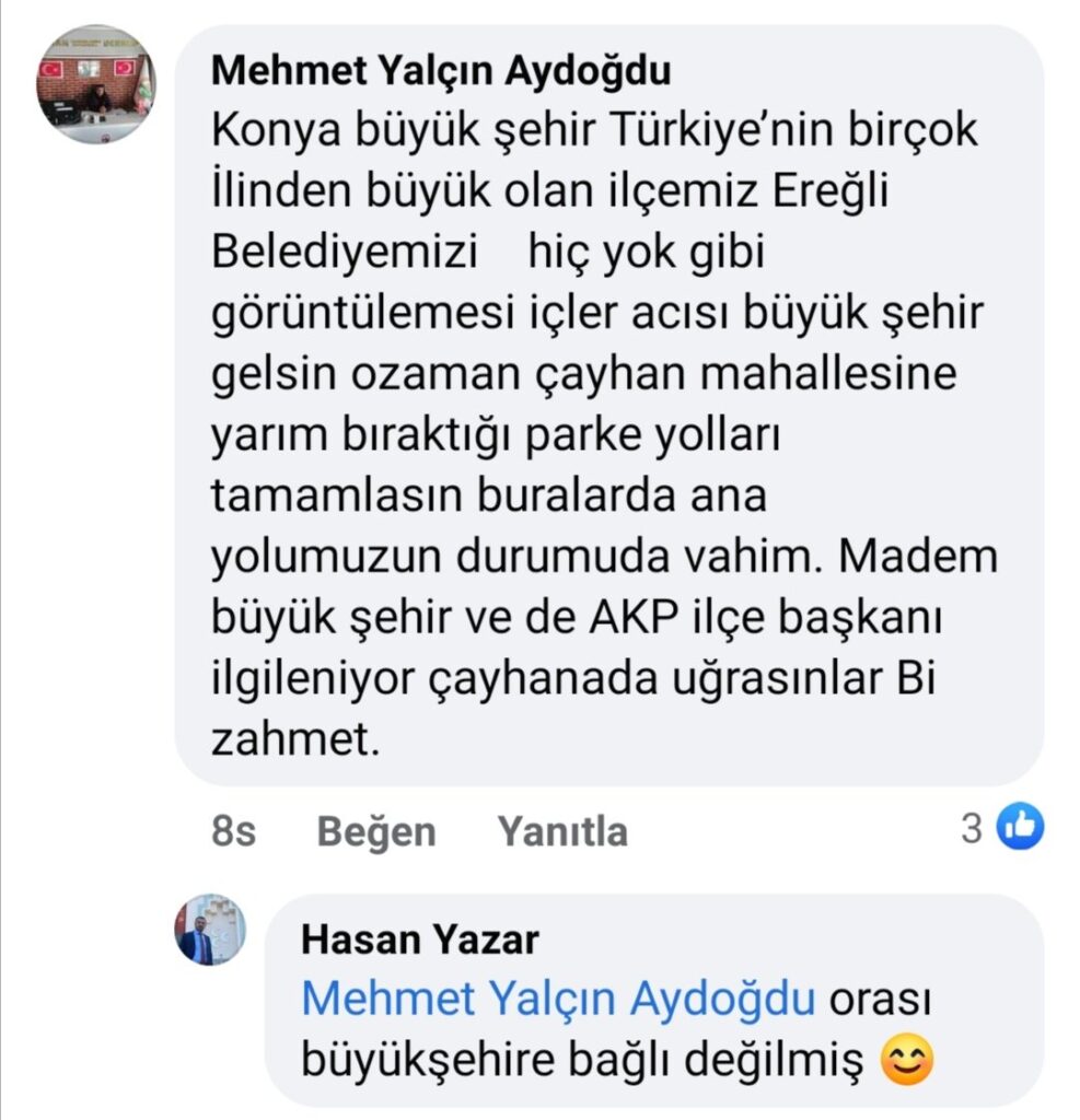 Yönetimi MHP’de olan Ereğli Belediyesi’nin Meclis Üyesi Mehmet Yalçın Aydoğan sosyal medya hesabından AKP’li Konya Büyükşehir Belediyesi ve AKP Ereğli İlçe Başkanı Zübeyir Dursun’u eleştirdi.