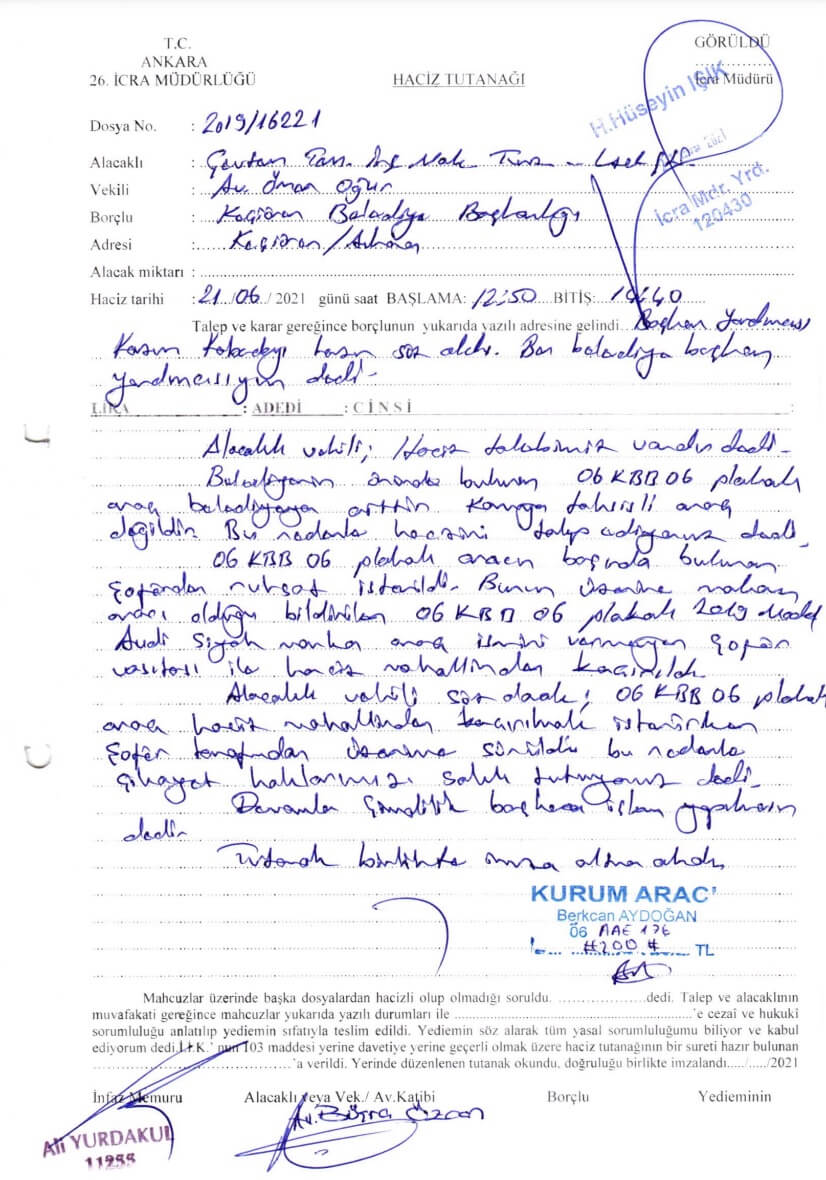 Haczedilenler arasında AKP’li Başkan Turgut Altınok’un 06 KBB 06 plakalı makam aracı da vardı. Şirket avukatı Büşra Özcan elinde kararlar, yanında icra memuruyla belediyeye gitti. Orada, Altınok’un şoföründen makam aracının ruhsatı istenildi. Sonra olanlar haciz tutanağına şöyle yansıdı: