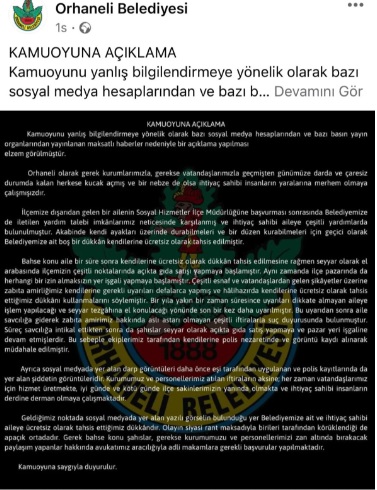 Çiftin iddialarının ardından Orhaneli Belediyesi‘nden yapılan açıklamada, “Söz konusu olayda ismi geçen kişiler belediyemizin sosyal yardımda bulunduğu muhtaç kişilerdir. Belediyemiz tarafından şu an işlettikleri dükkan kendilerine destek amaçlı tahsis edilmiştir. Şahıslar ilçedeki pazar yerine işgaliye bedeli ödemeden tezgah açmak isteyince esnaf tarafından şikayet edilmişlerdir. Belediyemize bağlı ekipler çiftin tezgahını kaldırmak isteyince bu tatsız iddialar ortaya atılmıştır. Söz konusu iddialar gerçek değildir. Olay şu an savcılığa intikal etmiş, sosyal hizmetler müdürlüğümüz de gerekli işlemleri başlatmıştır” denildi.