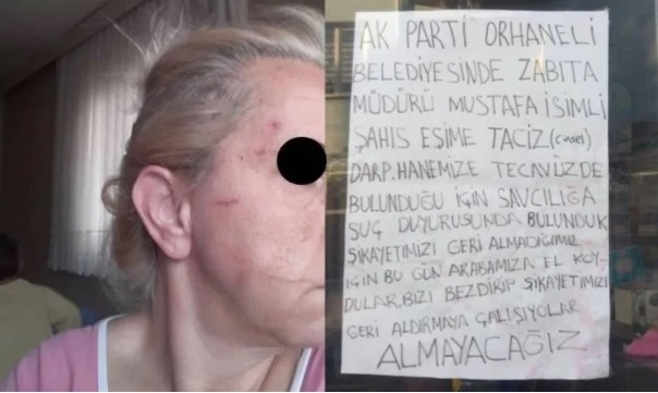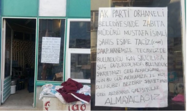 “Ak Parti Orhaneli Belediyesi’nde zabıta müdürü Mustafa isimli şahıs, eşime cinsel taciz, darp ve hanemize tecavüzde bulunduğu için savcılığa suç duyurusunda bulunduk. Şikayetimizi geri almadığımız için bugün arabamıza el koydular. Bizi bezdirip şikayetimizi geri aldırmaya çalışıyorlar. Almayacağız”