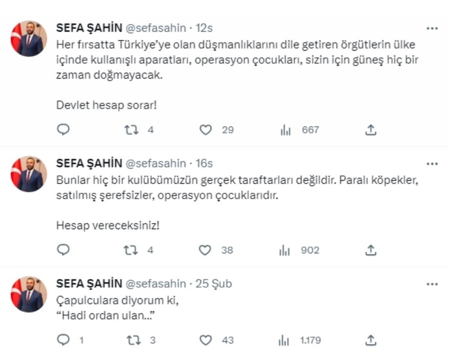 Ardından üslubunu ağırlaştıran Şahin, “Bunlar hiç bir kulübümüzün gerçek taraftarları değildir. Paralı köpekler, satılmış şerefsizler, operasyon çocuklarıdır. Hesap vereceksiniz!” ifadelerini kullandı.