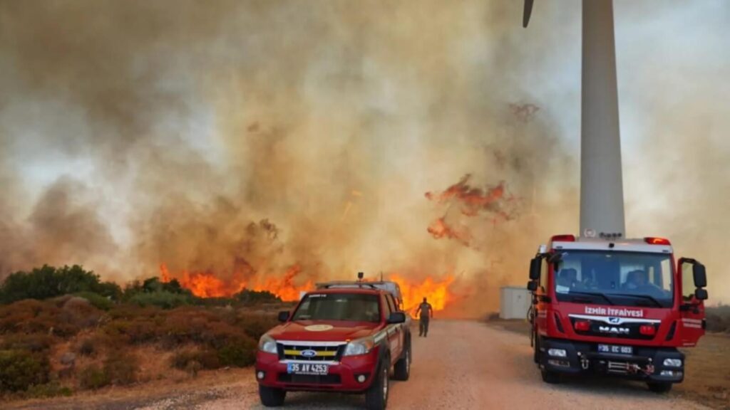 Öte yandan yangın, Rüzgar Enerji Santralleri (RES)’ninde etrafını sardı. Rüzgarın etkisiyle büyüyen yangın, İzmir-Çeşme otoyoluna kadar ilerledi.